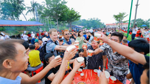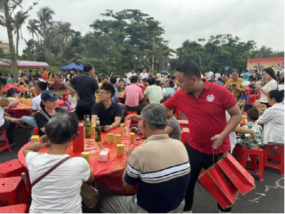 “村VA”作为海南文昌极具特色的草根体育IP,以排球为纽带,深深凝聚着当地百姓的乡土情怀与运动热情。晚宴不仅是赛事的序曲,更是情感的延伸。村VA球员与观众亲密互动,将赛场上奋力拼搏的精神延续至餐桌旁。台源酒的倾情加入,不仅为赛事增添了深厚的文化韵味,更以“福到万家”的美好寓意,将体育盛事的欢乐与祝福传递至千家万户。